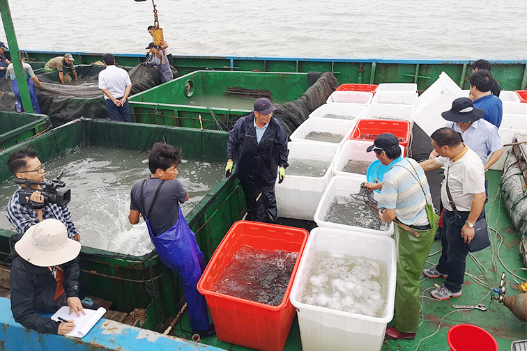 上午8時(shí),東臺(tái)公司、東臺(tái)市農(nóng)業(yè)農(nóng)村局、公證處等部門負(fù)責(zé)人和漁業(yè)技術(shù)專家及漁民代表乘船從如東太陽(yáng)島重件碼頭出發(fā),10時(shí)抵達(dá)東臺(tái)市145漁區(qū),2019年度增殖放流活動(dòng)正式開始。省海洋漁業(yè)指揮部、省漁業(yè)技術(shù)推廣中心、東臺(tái)市漁業(yè)技術(shù)站的專家對(duì)苗種品種、規(guī)格、數(shù)量及質(zhì)量等指標(biāo)進(jìn)行現(xiàn)場(chǎng)檢查、嚴(yán)格把關(guān),保障放流苗種質(zhì)量安全。隨后,工作人員將超過860萬尾的大黃魚和大黃魚標(biāo)志魚苗種投放大海,苗種金額達(dá)450萬元。