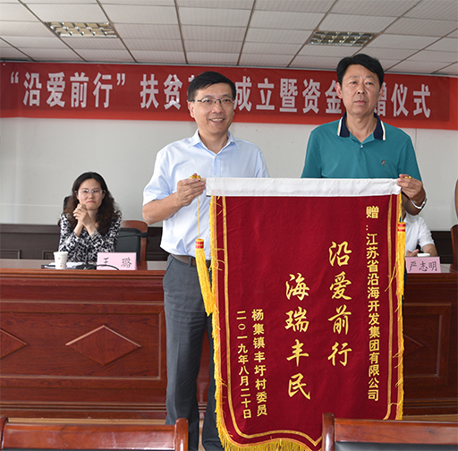 9月5日上午,鄧東升一行參加了“沿愛前行”扶貧基金成立暨資金捐贈儀式。鄧東升代表省沿海開發(fā)集團向封圩村捐贈150萬元成立扶貧濟困慈善基金,該基金將長久續(xù)存并持續(xù)產生穩(wěn)定收益,基金權益及投資收益全部歸屬封圩村,專項用于幫扶封圩村失學兒童、孤寡老人、殘疾人、因病因災返貧等生活困難的低收入家庭。封圩村向沿海集團贈送了“沿愛前行、海瑞豐民”錦旗。鄧東升在講話中指出,作為省屬企業(yè)和省“五方掛鉤”成員單位,省沿海開發(fā)集團積極貫徹省委省政府“全力打好江蘇精準脫貧攻堅戰(zhàn)”的總體要求,聚焦“兩不愁三保障”目標,探索建立扶貧長效機制,真扶貧、扶真貧;鎮(zhèn)村要嚴格執(zhí)行基金管理辦法,將每一分錢都花在刀刃上,扶貧濟困、慈善助學,做到真脫貧、脫真貧,讓封圩村的低收入群體和弱勢群體有更多的參與感、獲得感和幸福感;沿海集團將以此次成立扶貧基金為契機,既“輸血”又“造血”,繼續(xù)加大幫扶力度,鞏固拓展脫貧成果。
