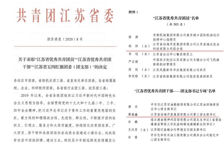 5月13日,共青團(tuán)江蘇省委下發(fā)文件《關(guān)于表彰“江蘇省優(yōu)秀共青團(tuán)員”“江蘇省優(yōu)秀共青團(tuán)干部”“江蘇省五四紅旗團(tuán)委(團(tuán)支部)的決定”》,省沿海集團(tuán)青年員工鄭陽(yáng)同志榮獲“江蘇省優(yōu)秀共青團(tuán)員”榮譽(yù)稱號(hào)、第三團(tuán)支部書(shū)記黃盛鑫同志榮獲“江蘇省優(yōu)秀共青團(tuán)干部——團(tuán)支部書(shū)記專項(xiàng)”榮譽(yù)稱號(hào)。