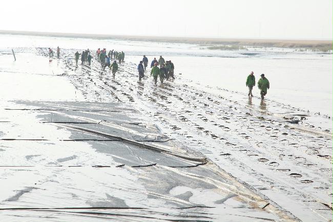2012年11月18日上午11:18分,條子泥匡圍一期工程四-1標(biāo)段開始軟體排鋪設(shè)作業(yè);2012年11月21日上午10:28分,條子泥匡圍一期工程四-2標(biāo)段開始軟體排鋪設(shè)作業(yè)。至此,條子泥匡圍一期工程北片圍墾工程全線開工。