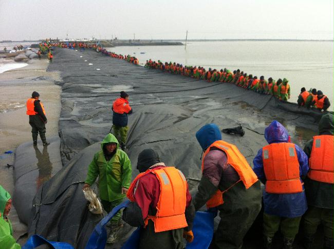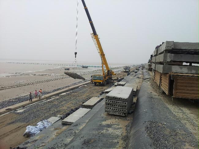 條北片匡圍面域范圍廣、圍堤長(zhǎng)、灘面情況復(fù)雜。項(xiàng)目開(kāi)工以來(lái),為搶抓冬季灘涂圍墾的有利機(jī)遇,工程建設(shè)單位、監(jiān)理單位和施工單位一道商議方案,調(diào)配機(jī)械,增加人員,共投入施工及管理人員近1800人,大型施工機(jī)械41臺(tái),發(fā)電設(shè)備21臺(tái),水利沖挖施工設(shè)備142臺(tái)套,通過(guò)采用吸沙船等先進(jìn)施工設(shè)備,全力推進(jìn)工程施工進(jìn)度。目前,11.04公里隔堤已全部形成,達(dá)標(biāo)段達(dá)98%。東堤2+600至13+452位置施工斷面圍堰已施工外棱體至▽5.0以上,回填土達(dá)到▽4.0左右。截至1月底,條北片新開(kāi)工項(xiàng)目共計(jì)完成軟體排鋪設(shè)74.26萬(wàn)平方米,施工吹沙袋棱體土方66.23萬(wàn)立方米,吹填砂48.7萬(wàn)立方米。同時(shí),通過(guò)一系列行之有效的措施,1號(hào)隔堤以南龍口于2013年1月23日成功實(shí)現(xiàn)了全部龍口截流,至此,在條南片3.33萬(wàn)畝圍區(qū)之后,條北片南側(cè)又有3.6萬(wàn)畝圍區(qū)實(shí)現(xiàn)滄海變桑田。此次龍口截流工程還在江蘇圍墾史上首次實(shí)現(xiàn)了三個(gè)互有影響的龍口同時(shí)在一個(gè)潮汛期內(nèi)合龍,并經(jīng)受住了農(nóng)歷十八天文大潮的沖擊。