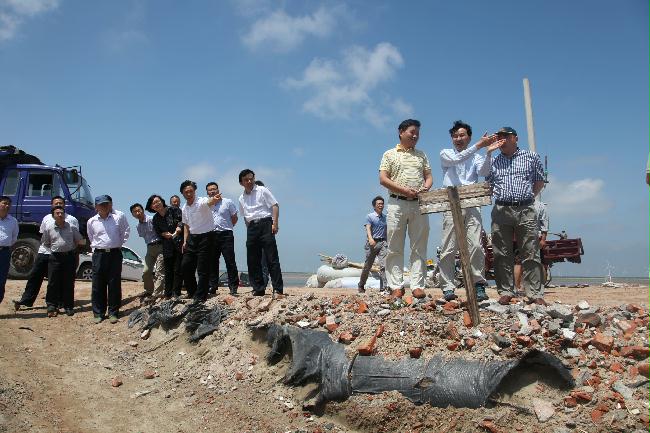 受西大港潮溝擺動及6月7日至9日風(fēng)暴潮影響,條子泥一期工程東堤部分段面出現(xiàn)圍堤防護(hù)工程垮塌,局部堤身被破壞的險(xiǎn)情,嚴(yán)重影響已成型海堤安全。為盡快修復(fù)受損段面,抑制港槽進(jìn)一步向海堤擺動,采取科學(xué)合理的工程措施避免工程再次遭受較大損失,在集團(tuán)公司領(lǐng)導(dǎo)的要求下,2013年6月14日,省沿海開發(fā)集團(tuán)有限公司在東臺弶港組織召開了“條子泥一期工程東堤險(xiǎn)段防護(hù)方案”咨詢會。會議邀請了規(guī)劃研究、設(shè)計(jì)、施工等方面的相關(guān)專家,就四標(biāo)2東堤受風(fēng)暴潮影響及西大港潮溝擺動對新建海堤的威脅,當(dāng)前須采取的防護(hù)及潮溝治理方案進(jìn)行咨詢。集團(tuán)公司陳才俊副總經(jīng)理,投資發(fā)展處徐向紅處長,東臺公司周金陽總經(jīng)理及條北片匡圍工程建設(shè)、施工、監(jiān)理單位的代表參加了咨詢會。