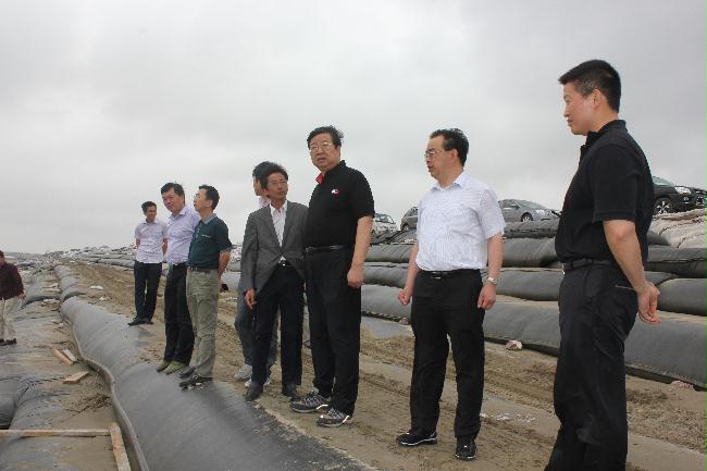 6月7日至9日,東臺(tái)沿海地區(qū)連續(xù)出現(xiàn)大雨、大風(fēng)天氣,沿海風(fēng)力達(dá)到10級(jí),致使條子泥一期工程新建海堤、防護(hù)工程等基礎(chǔ)設(shè)施遭受嚴(yán)重破壞。集團(tuán)公司高度重視條子泥海堤搶險(xiǎn)工作,集團(tuán)公司領(lǐng)導(dǎo)第一時(shí)間趕赴工程現(xiàn)場(chǎng)指導(dǎo)搶險(xiǎn)工作并一直關(guān)心搶險(xiǎn)工作的進(jìn)展情況。在多次過(guò)問(wèn)有關(guān)事宜的同時(shí),事隔10天,再次來(lái)到工程現(xiàn)場(chǎng)進(jìn)行檢查。