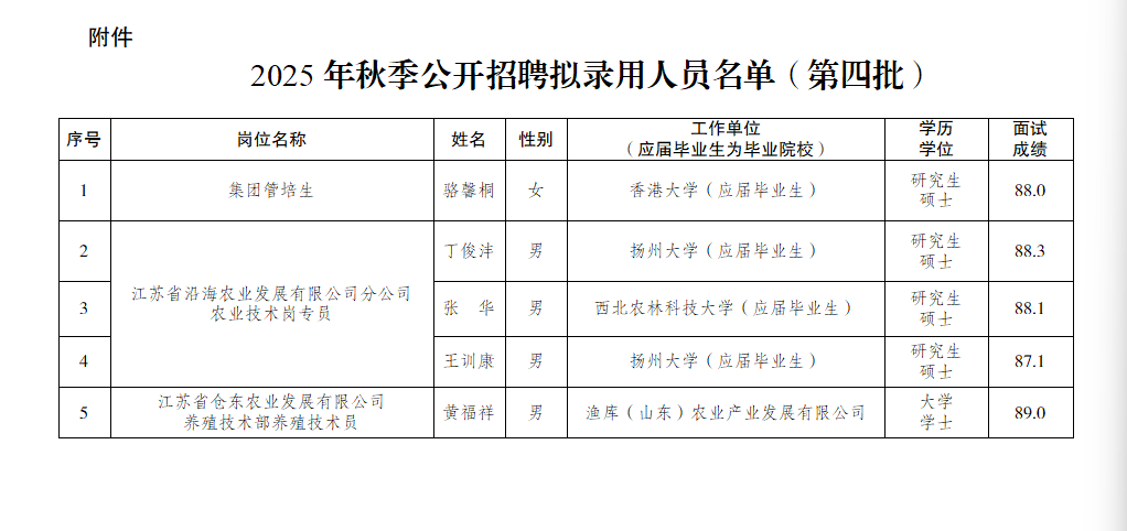 根據(jù)《江蘇省沿海開發(fā)集團(tuán)有限公司2025年秋季公開招聘工作人員公告》,經(jīng)報(bào)名、資格預(yù)審、適崗性評(píng)價(jià)、素質(zhì)測(cè)試、面試、入職體檢、背景調(diào)查、研究確定擬錄用人選等程序,現(xiàn)對(duì)擬錄用人員予以公示。