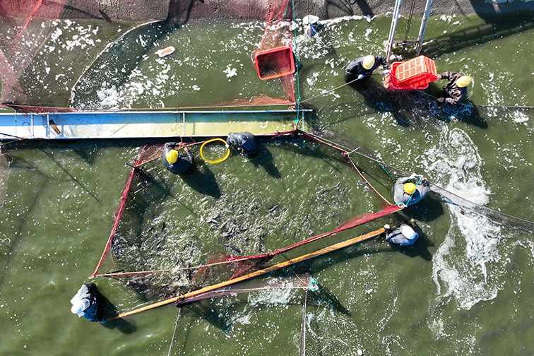 持續(xù)多日的晴好天氣讓春天的腳步越來越近,波光粼粼的水面涌動(dòng)著強(qiáng)信心、促發(fā)展的澎湃春潮。正月初七一大早,養(yǎng)殖塘口早已熱鬧起來,三五個(gè)身著捕魚服的工人漸漸收攏,一邊拉網(wǎng),一邊靠向岸邊,齊心協(xié)力把一網(wǎng)網(wǎng)鮰魚打撈上岸。在初升朝陽的映襯下,看著肥美鮰魚跳躍歡騰,工人們已是滿眼笑意。