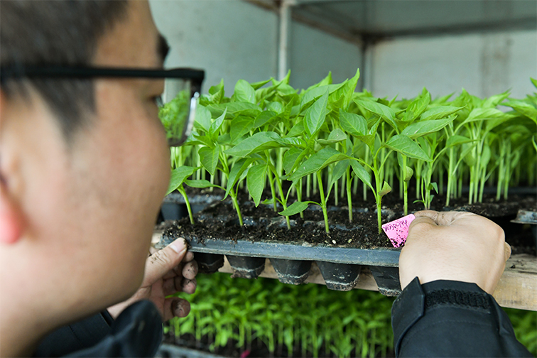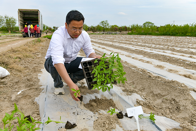 在距離劍豐試驗田70余公里的南通如東縣,省沿海集團所屬凌洋公司“揭榜掛帥”示范基地,數百個品種的辣椒苗整齊堆放在田埂上,爭先往外冒著綠芽兒,一派勃勃生機。江蘇省農業(yè)院蔬菜研究所副所長刁衛(wèi)平穿梭其間,不時俯身插入示意牌,等待苗株分類移栽。