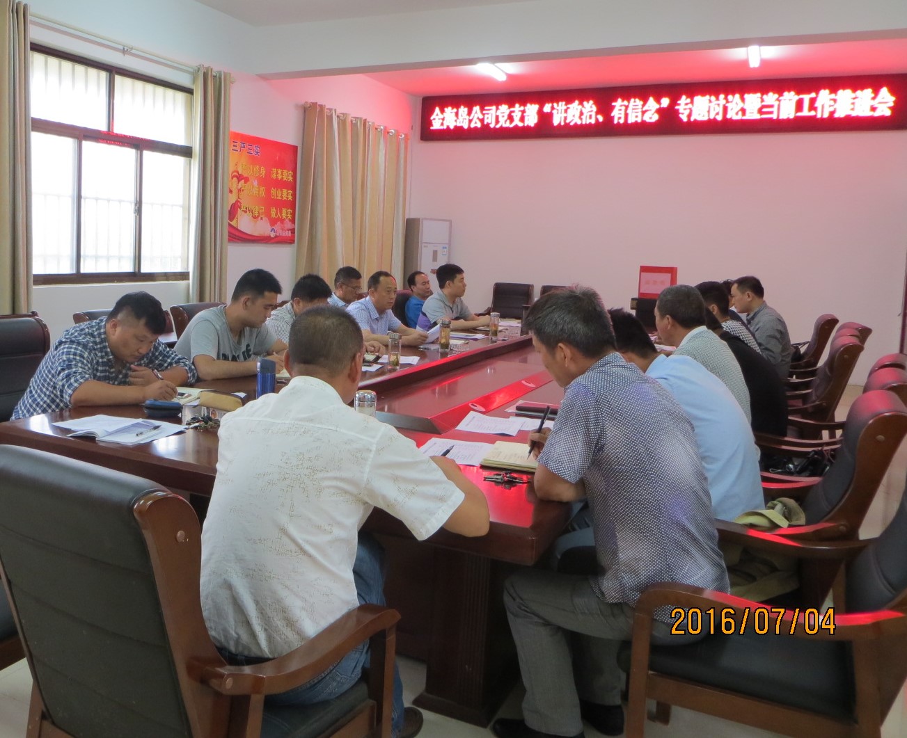 7月4日,金海島公司黨支部在辦公樓一樓會(huì)議室舉行了“講政治,有信念”專題討論暨當(dāng)前工作推進(jìn)會(huì)。支部書(shū)記薛太華結(jié)合金海島公司的工作現(xiàn)狀及對(duì)“兩學(xué)一做”的學(xué)習(xí)對(duì)“四講四有”中的“講政治、有信念”進(jìn)行了深刻分析。