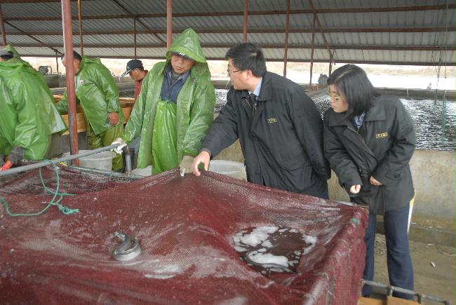 11月21日,鹽城市出入境檢驗(yàn)檢疫局檢查組到金東臺(tái)農(nóng)場(chǎng)檢查出口水產(chǎn)品質(zhì)量安全示范區(qū)日常監(jiān)管工作。檢查小組認(rèn)真聽取了質(zhì)量安全示范區(qū)建設(shè)領(lǐng)導(dǎo)小組副組長(zhǎng)、金東臺(tái)農(nóng)場(chǎng)場(chǎng)長(zhǎng)任之華的匯報(bào)。隨后,檢查小組仔細(xì)察看了日常監(jiān)管記錄,并冒雨親赴各塘口檢查,悉心詢問投入品使用情況以及具體的監(jiān)管措施,通報(bào)了國家對(duì)投入品最新的監(jiān)管要求,對(duì)個(gè)別細(xì)節(jié)問題提出了整改意見。最后,檢查小組對(duì)日常監(jiān)管整體工作表示滿意,并指出,示范區(qū)的監(jiān)管方式是行之有效的,通過規(guī)范、合理、嚴(yán)格的質(zhì)量安全監(jiān)管,示范區(qū)的放心農(nóng)產(chǎn)品大大豐富了居民的菜籃子。